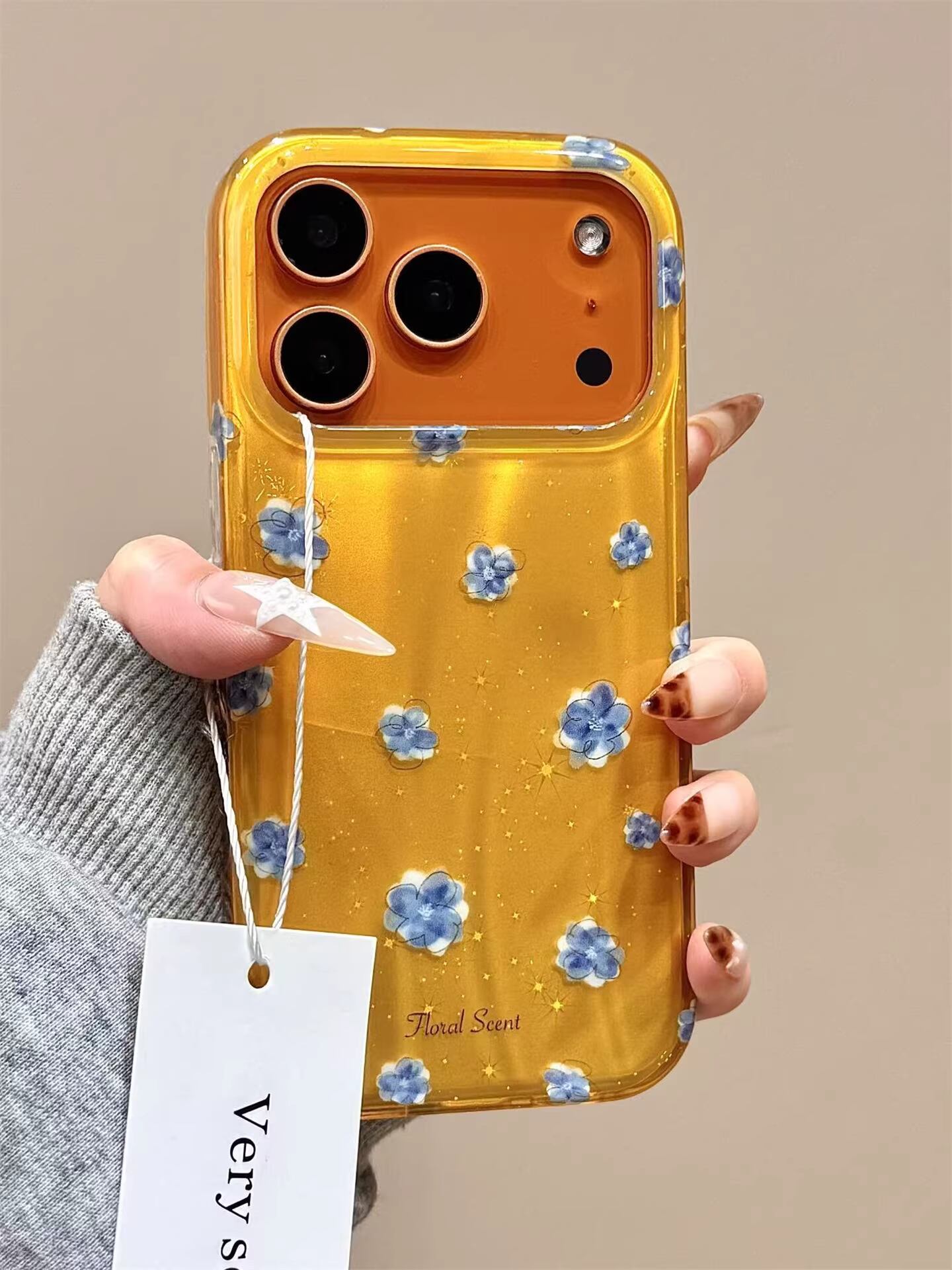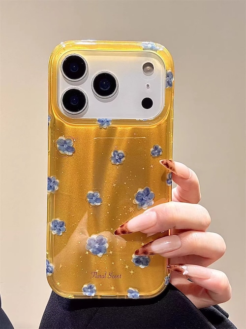 透明感のあるイエローカラーに、繊細なブルーフラワーとゴールドラメを散りばめた上品で大人可愛いiPhoneケース。