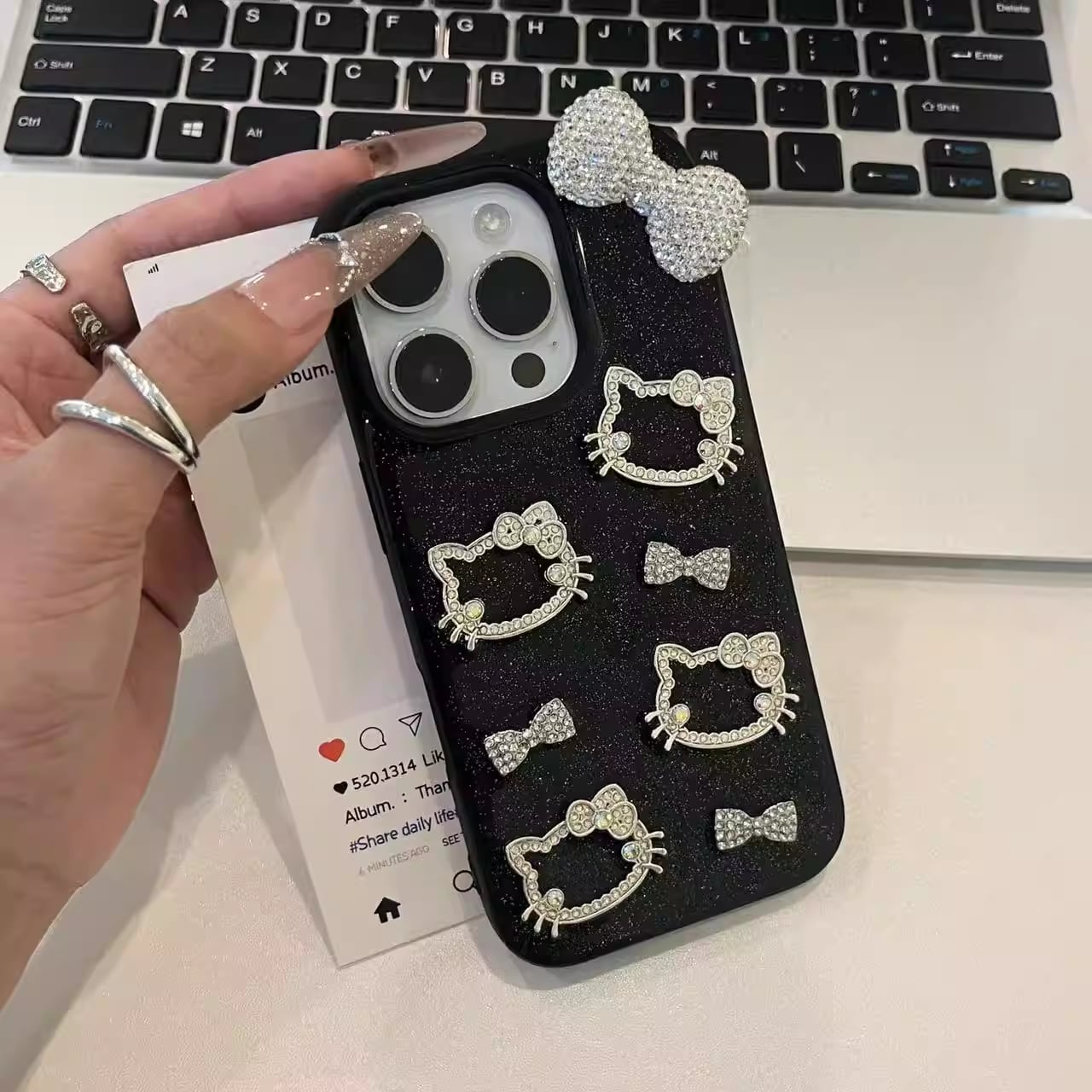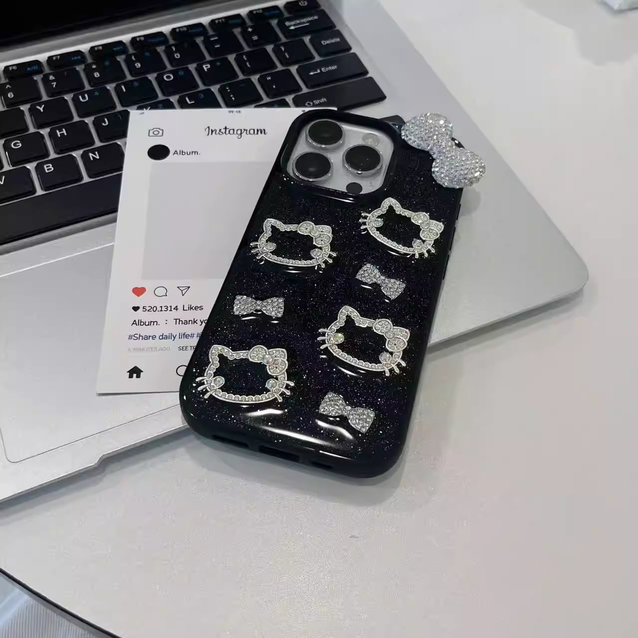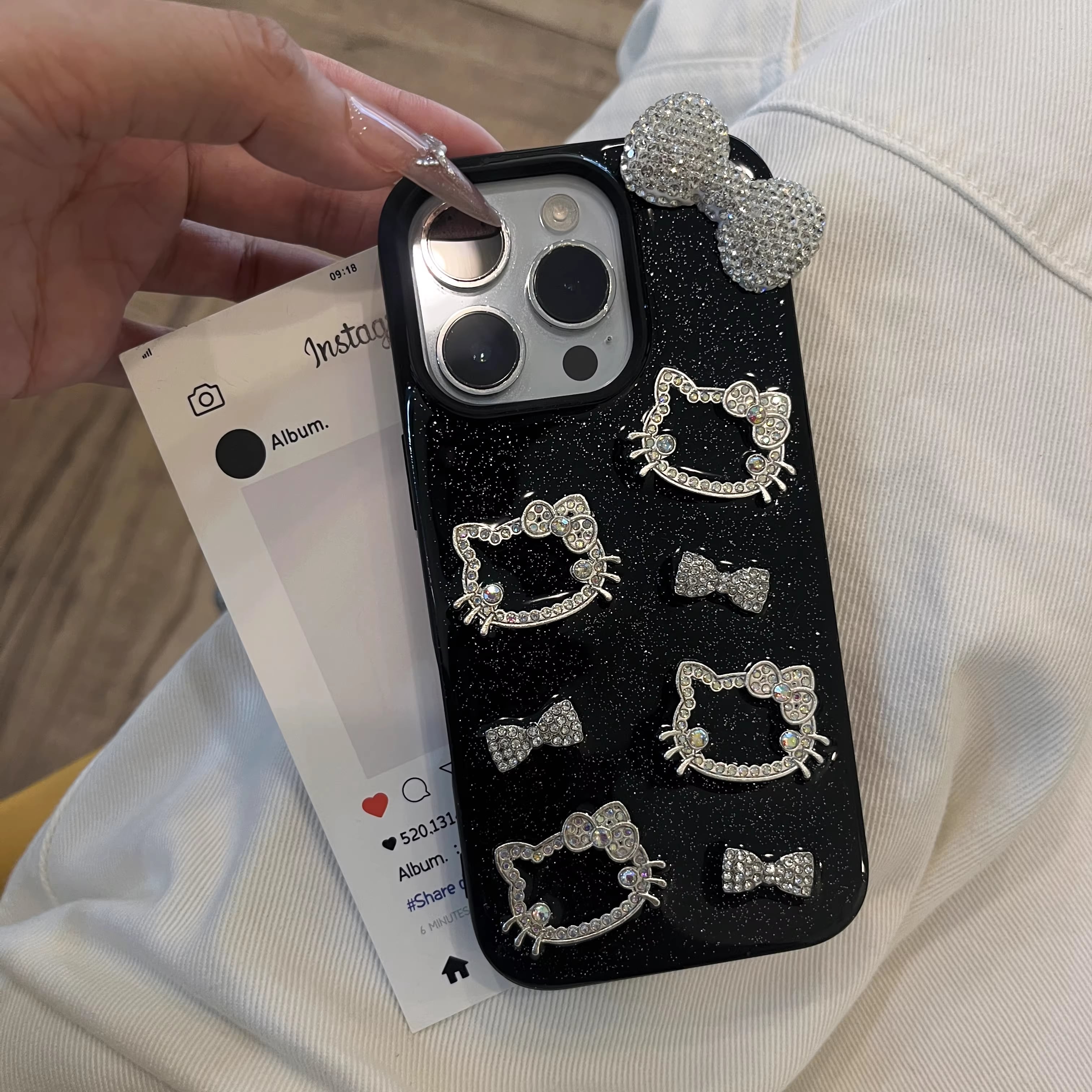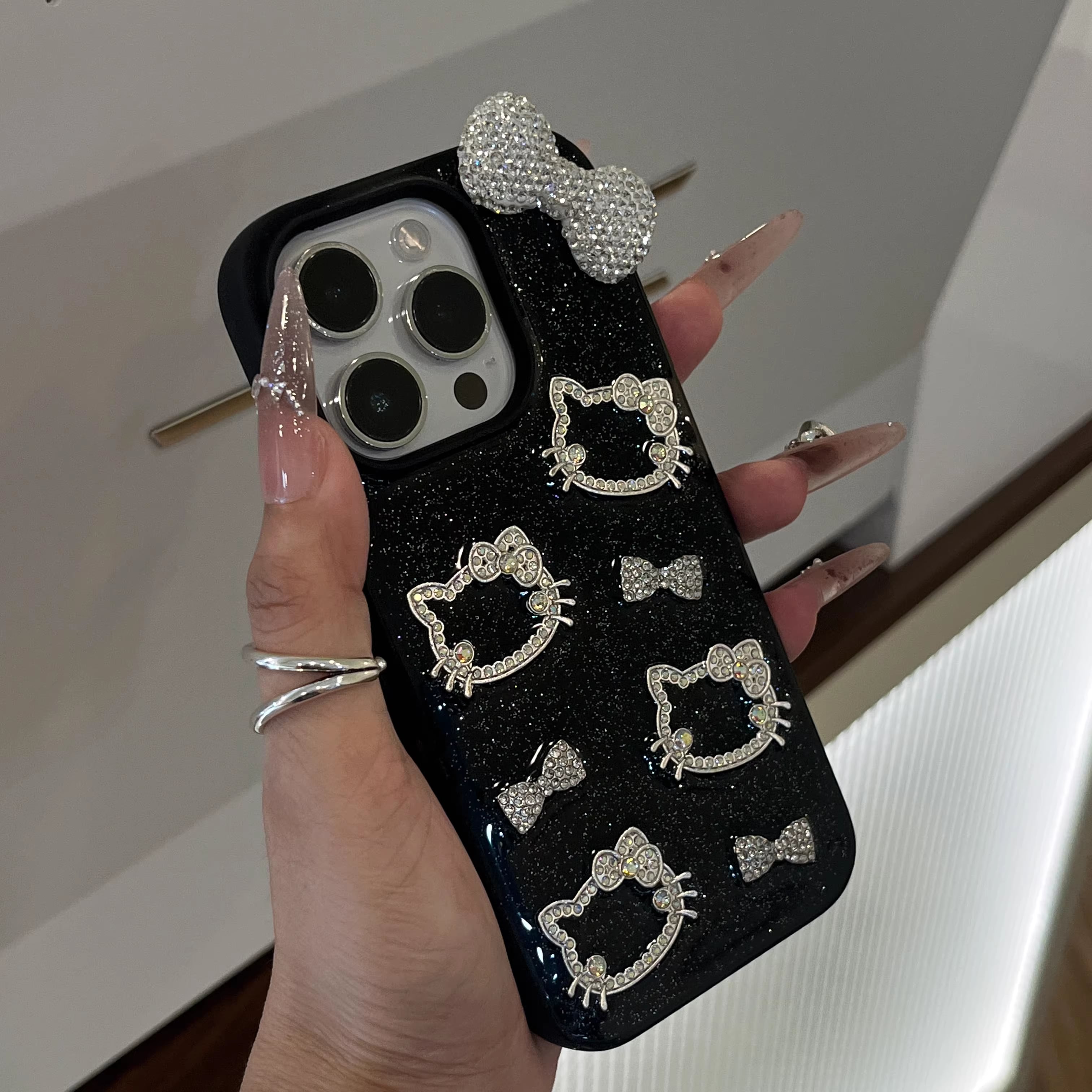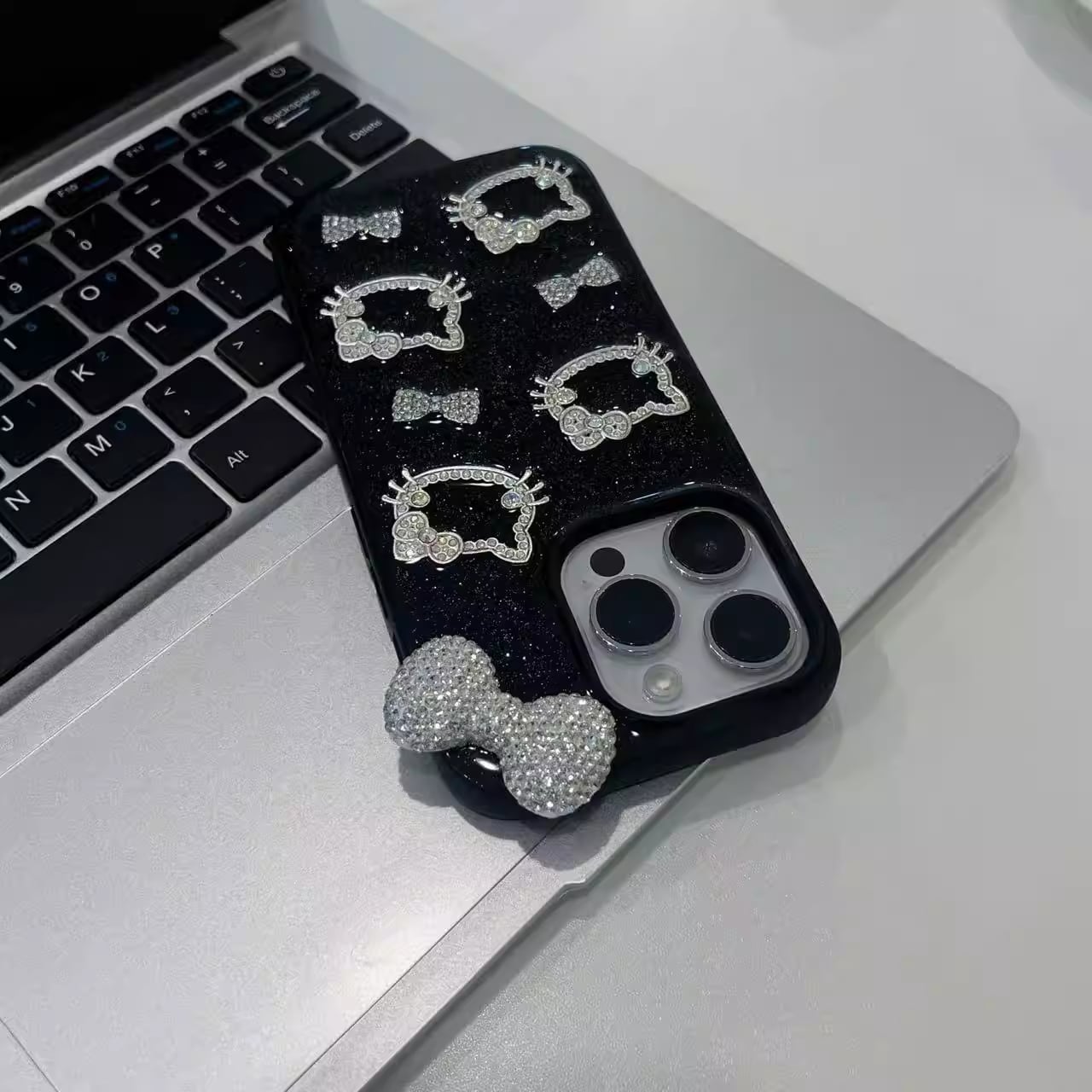 ブラックベースに繊細なラメを散りばめ、ラインストーンで仕上げた猫モチーフとリボンが輝くラグジュアリーiPhoneケース。