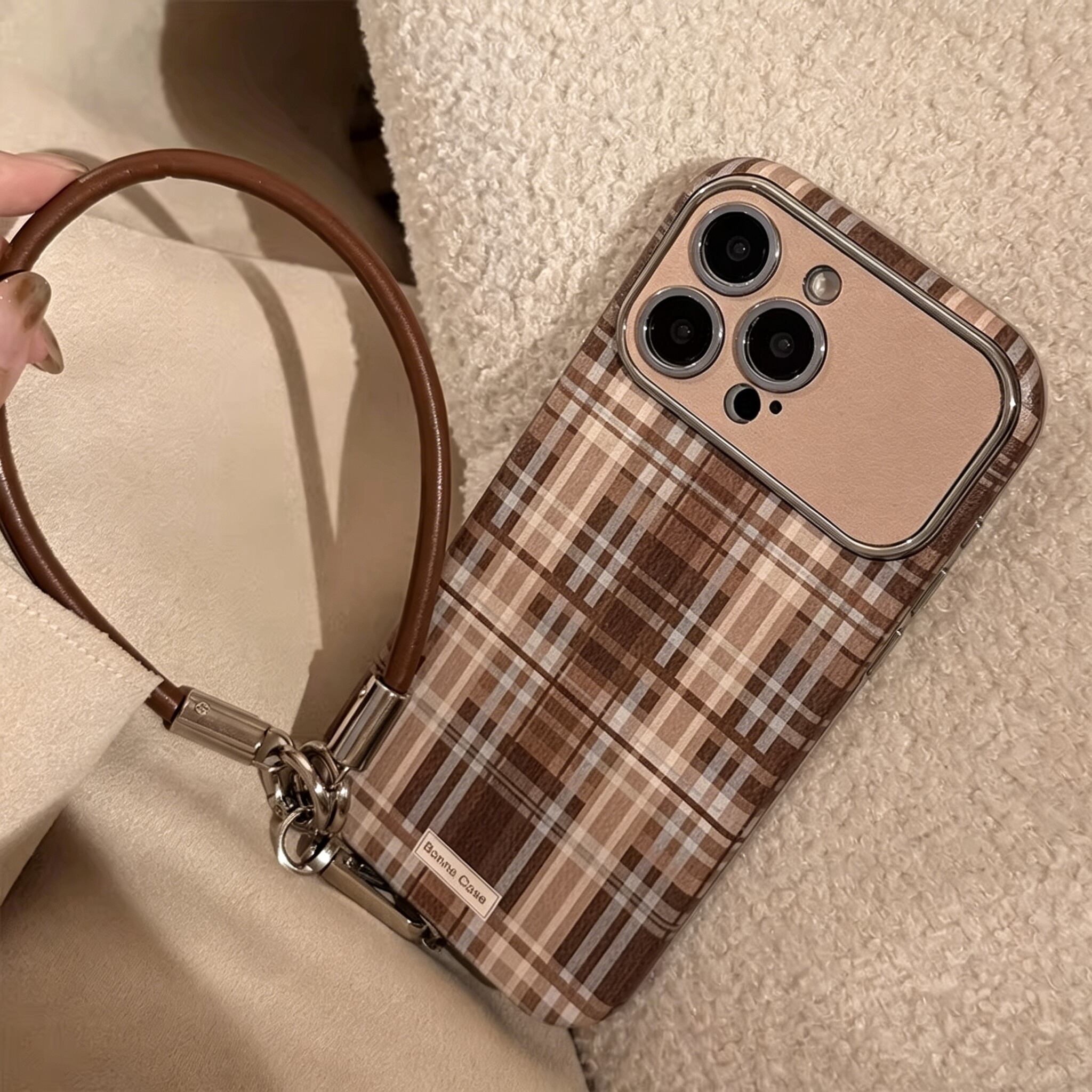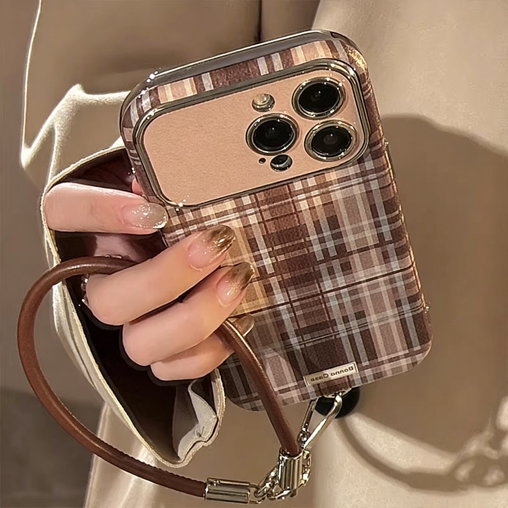 ハンドストラップ付 iPhone17 Pro Maxケース チェック柄 タータンチェック iPhone17 Proケース 格子柄 レザー調 iPhone16 15Pro保護ケース メタリックフレーム カジュアル iPhone14 13Pro Maxケース 大人向け 高級感 ニュアンスカラー 韓国 人気 トレンド