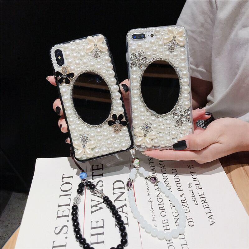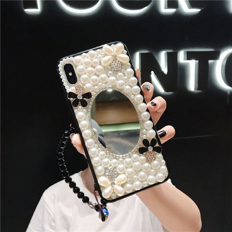 ミラー付き iPhonexs/xr/8/7plus/6s デコケース パール キュート ライストーン キラキラ 花柄 華奢 女子 新作「ハンドメイド製品」