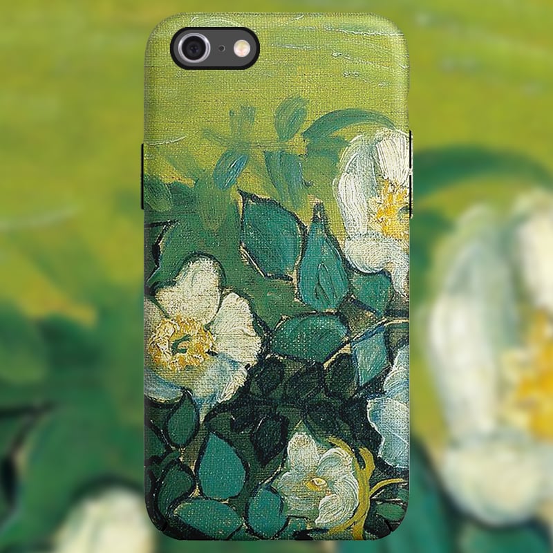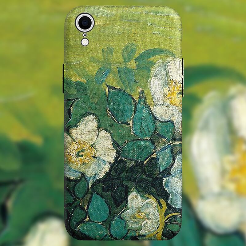 アイフォンXS 11 12Pro 13ProMaxケース 白いバラ 油絵【蛍光型】iPhoneケース かわいい 大人 芸術感 おしゃれ♪