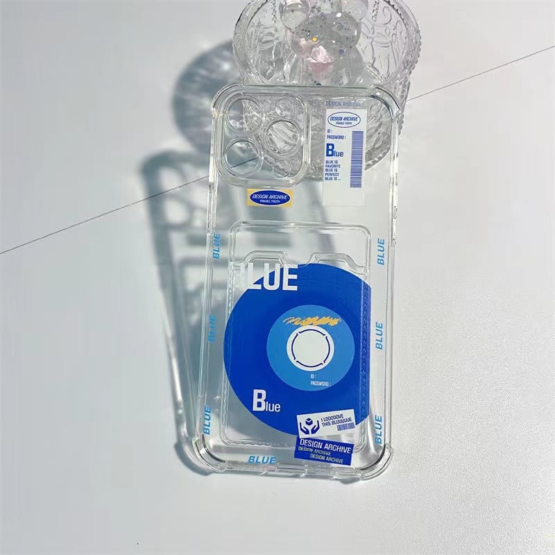 iPhone14Pro Max/14/13ケース ラベル風 ブルー カードポケット★ アイフォン13プロケース 人気クリア シンプル 格好良い 便利◎