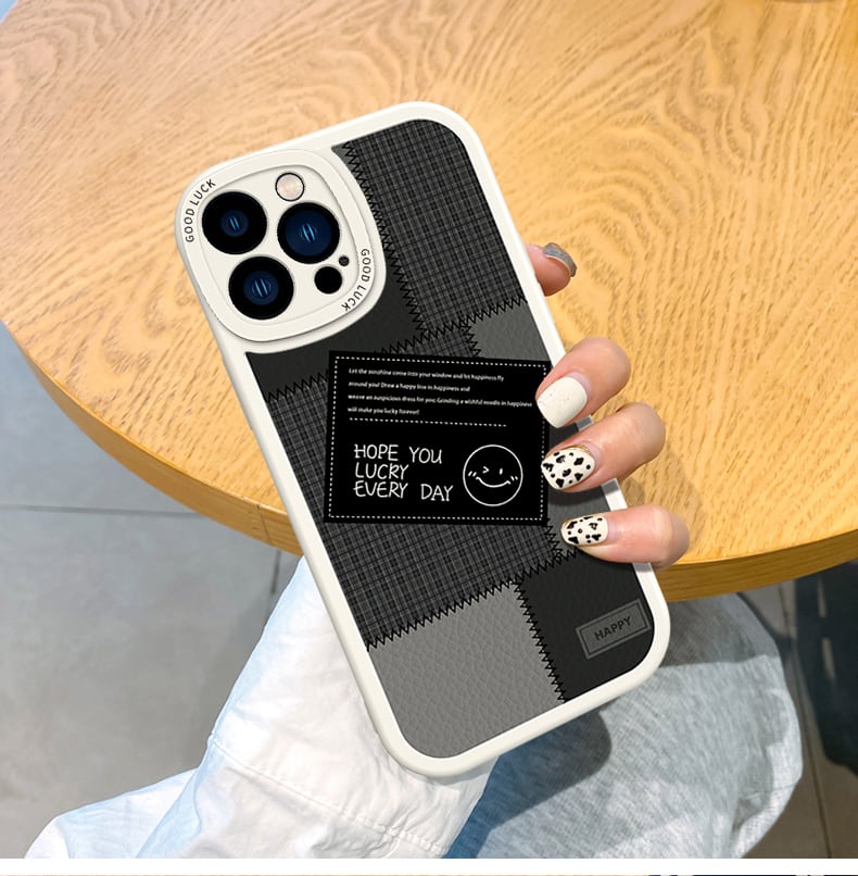 iPhone14 Pro Max/13/12ケース ラベル チェック柄 笑顔 ペア★アイフォン14プロケース 幸運 上品 ブラック系 メンズ向け!