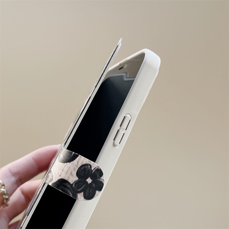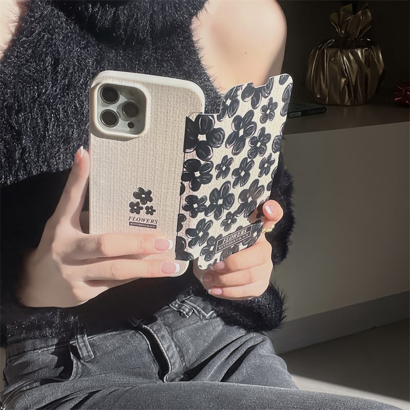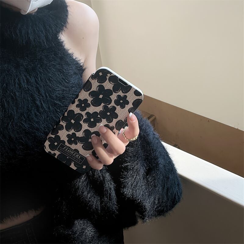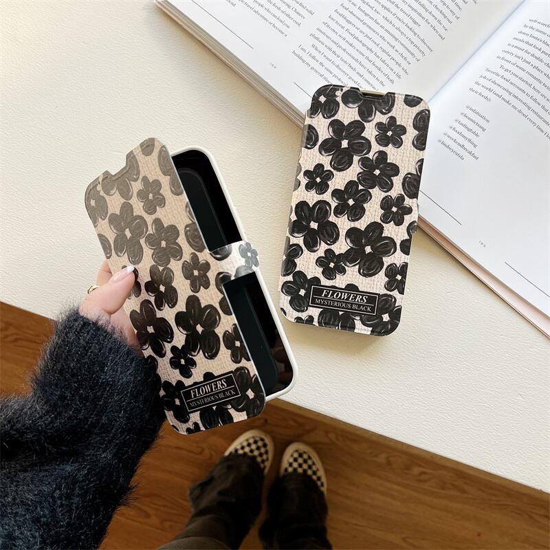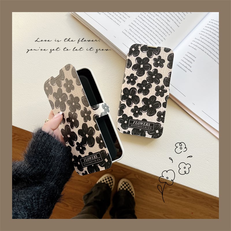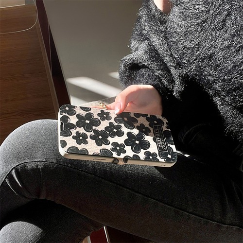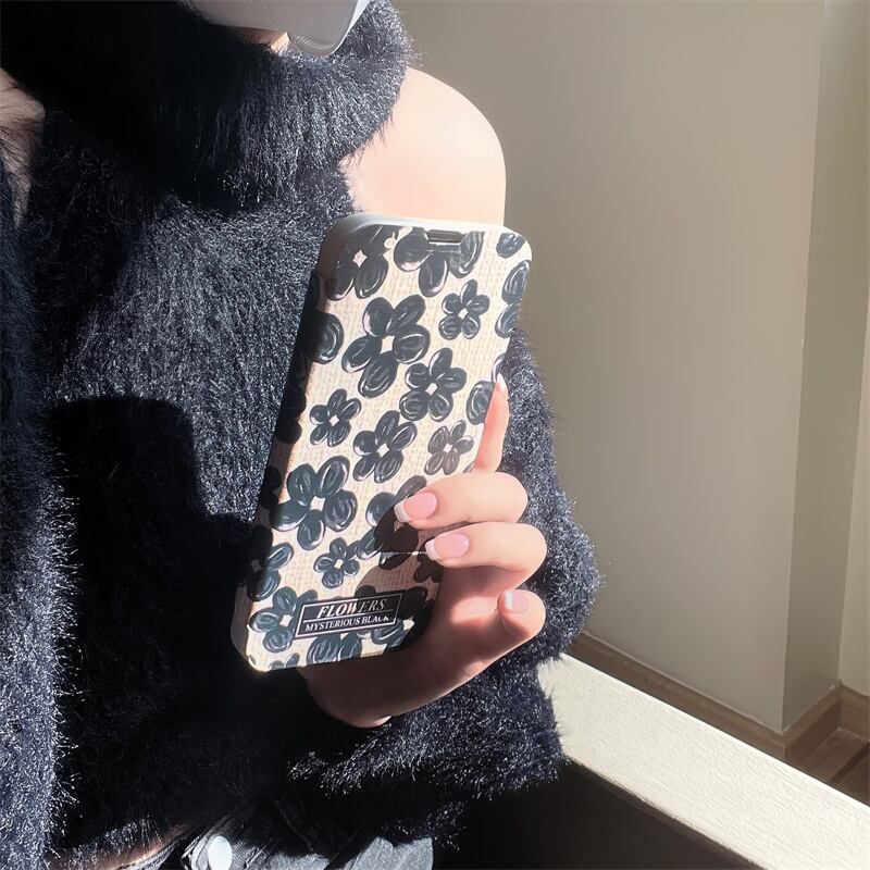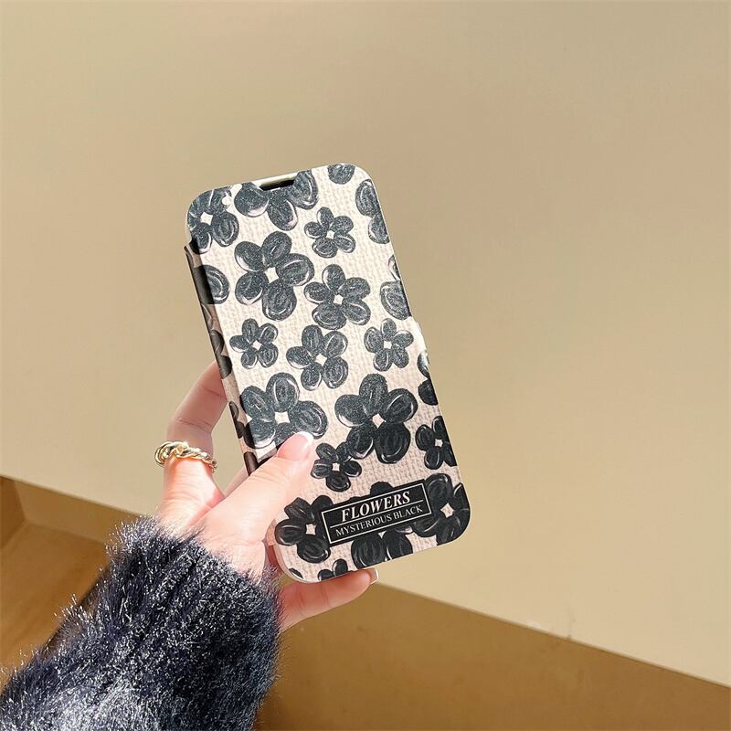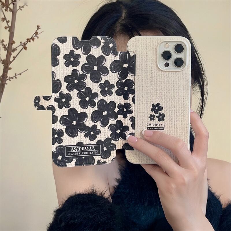 iPhone14 Pro Max/13/12ケース ブラック お絵描き風 花柄 手帳型 アイフォン14プロケース 可愛い フラワー 大人女性 お洒落カバー◎