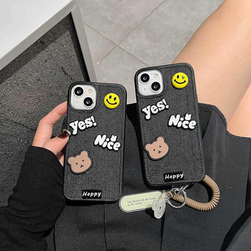 カジュアル iPhone15 Pro Maxケース デニム風 iPhone対応 笑顔 くまさん YES NICE アクセサリー ストラップ付き iPhone15 Proケース 大人かわいい iPhone 14ProMax 14Pro 13 12 11カバー 韓国女子愛用 オシャレ♪