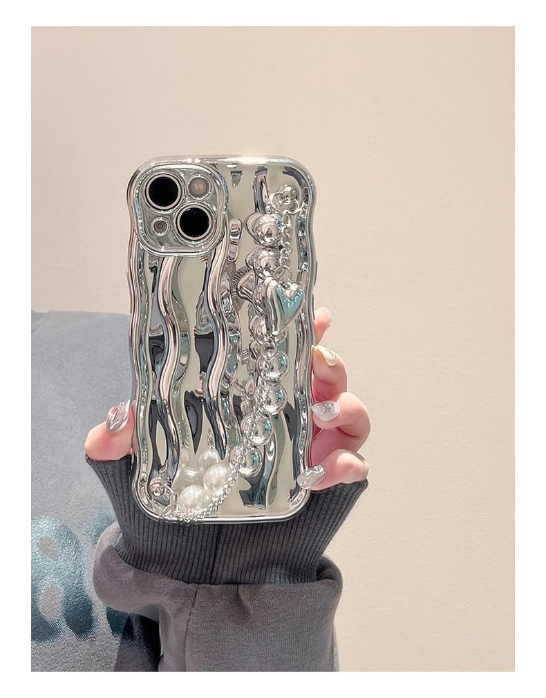 iPhone15 Pro Maxケースうねうね メタルカラー iPhone15 Proケース 高級感 テクスチャ iPhone15保護ケース シルバー 手持チェーン付き iPhone14 13 12Proケース 立体的 かわいい◎